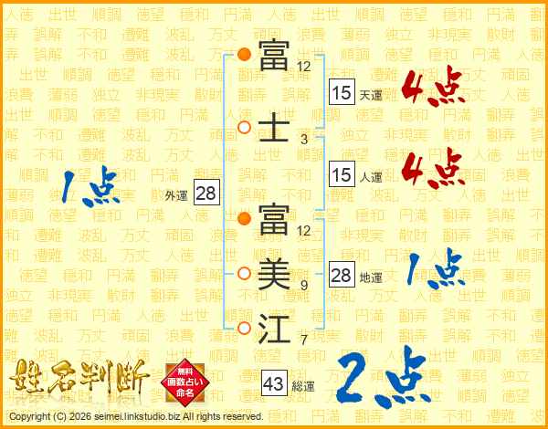 富(12画)士(3画) 富(12画)美(9画)江(7画)