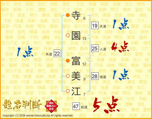 寺(6画)園(13画) 富(12画)美(9画)江(7画)