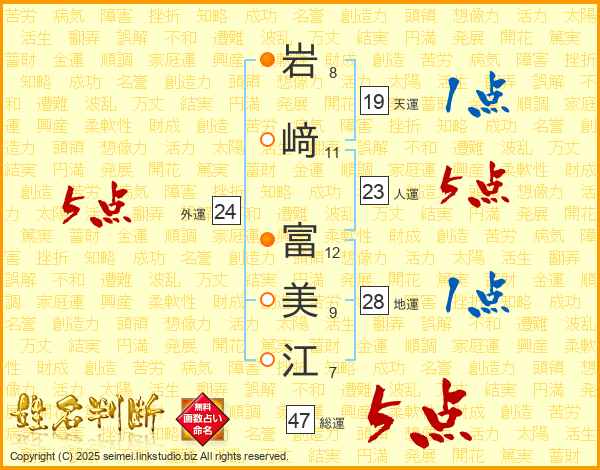 岩(8画)﨑(11画) 富(12画)美(9画)江(7画)