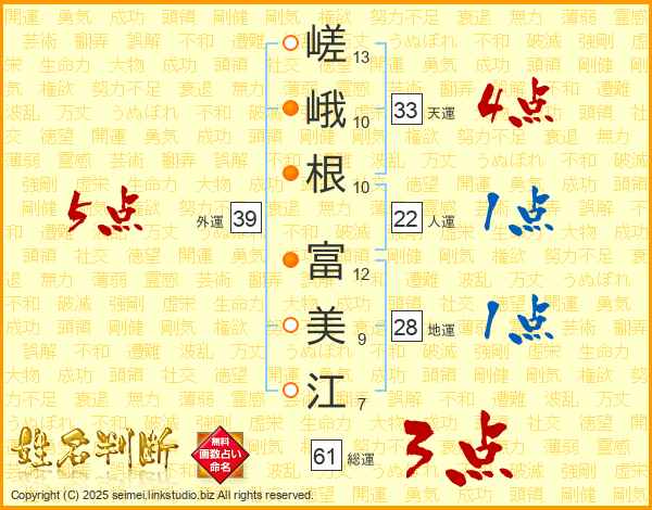 嵯(13画)峨(10画)根(10画) 富(12画)美(9画)江(7画)