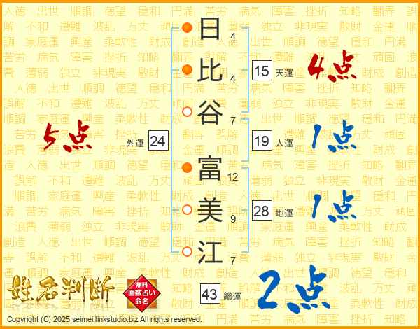 日(4画)比(4画)谷(7画) 富(12画)美(9画)江(7画)
