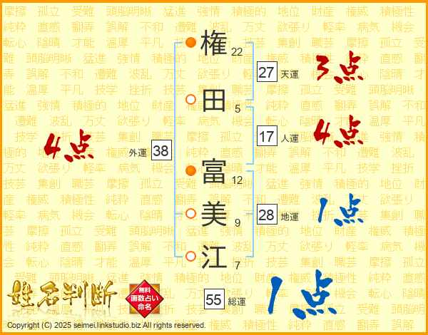 権(22画)田(5画) 富(12画)美(9画)江(7画)