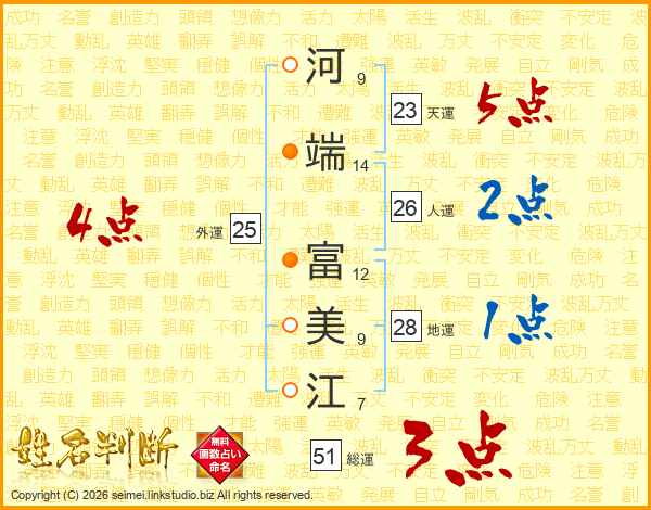 河(9画)端(14画) 富(12画)美(9画)江(7画)
