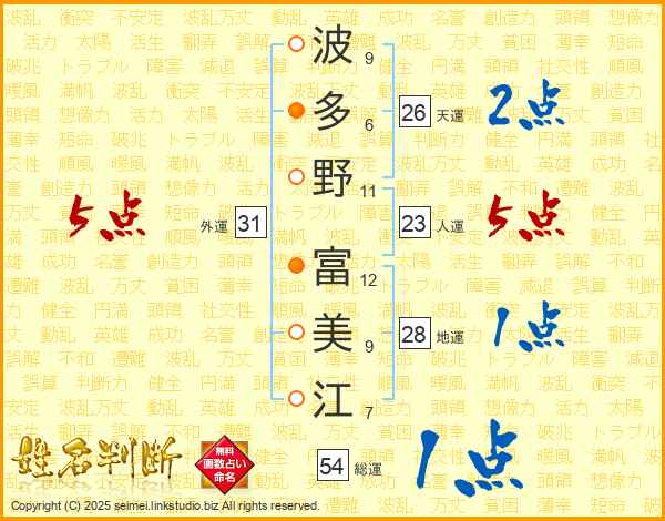 波(9画)多(6画)野(11画) 富(12画)美(9画)江(7画)