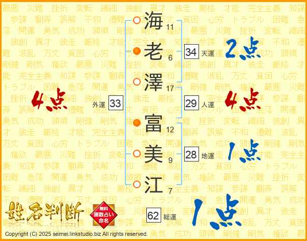 海(11画)老(6画)澤(17画) 富(12画)美(9画)江(7画)