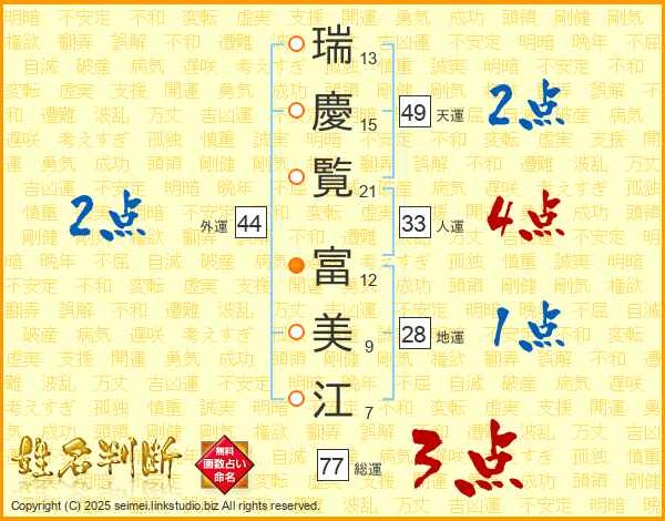 瑞(13画)慶(15画)覧(21画) 富(12画)美(9画)江(7画)