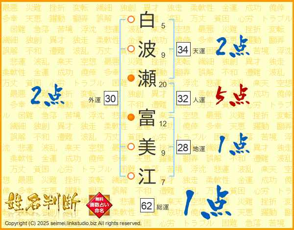 白(5画)波(9画)瀬(20画) 富(12画)美(9画)江(7画)