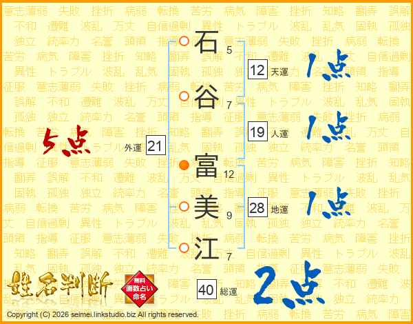 石(5画)谷(7画) 富(12画)美(9画)江(7画)