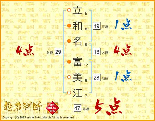 立(5画)和(8画)名(6画) 富(12画)美(9画)江(7画)