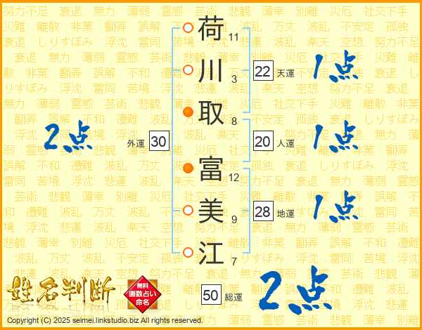 荷(11画)川(3画)取(8画) 富(12画)美(9画)江(7画)