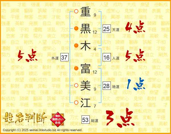 重(9画)黒(12画)木(4画) 富(12画)美(9画)江(7画)