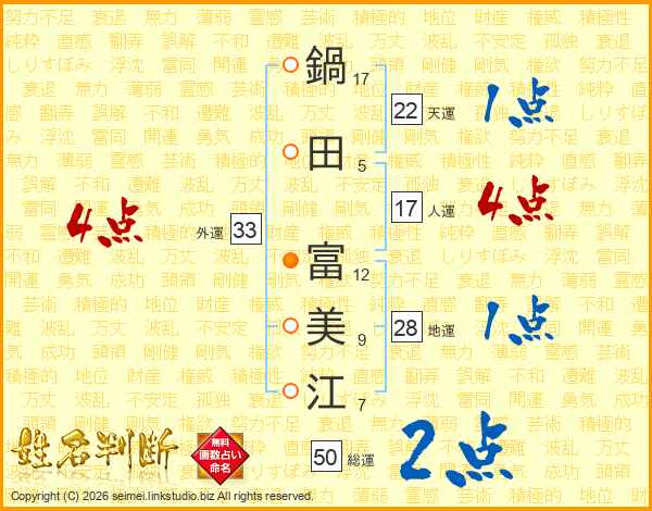 鍋(17画)田(5画) 富(12画)美(9画)江(7画)