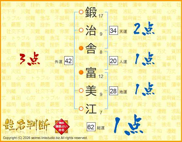 鍛(17画)治(9画)舎(8画) 富(12画)美(9画)江(7画)