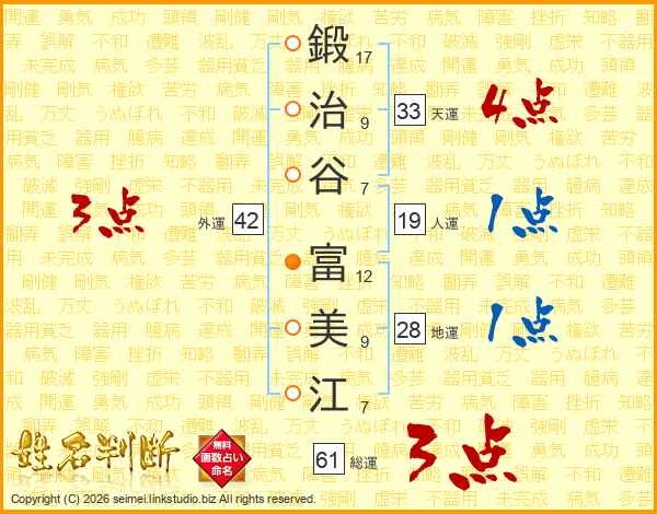 鍛(17画)治(9画)谷(7画) 富(12画)美(9画)江(7画)