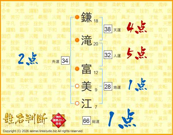 鎌(18画)滝(20画) 富(12画)美(9画)江(7画)