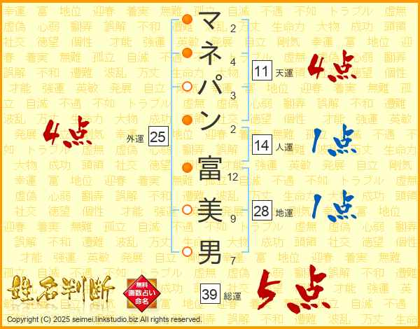 マ(2画)ネ(4画)パ(3画)ン(2画) 富(12画)美(9画)男(7画)