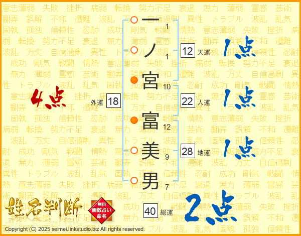 一(1画)ノ(1画)宮(10画) 富(12画)美(9画)男(7画)