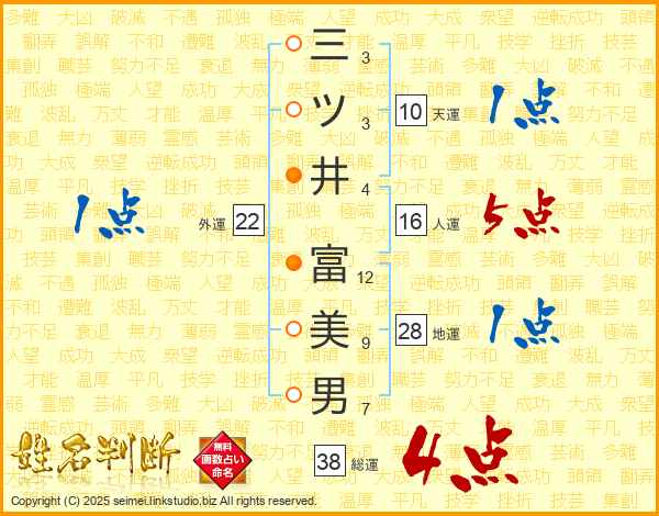 三(3画)ツ(3画)井(4画) 富(12画)美(9画)男(7画)