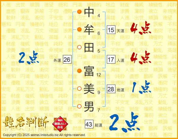 中(4画)牟(6画)田(5画) 富(12画)美(9画)男(7画)