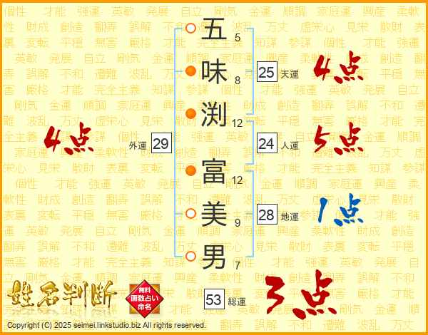 五(5画)味(8画)渕(12画) 富(12画)美(9画)男(7画)
