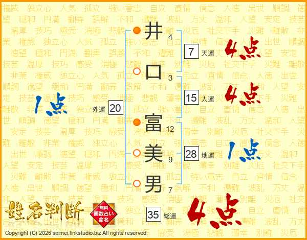 井(4画)口(3画) 富(12画)美(9画)男(7画)