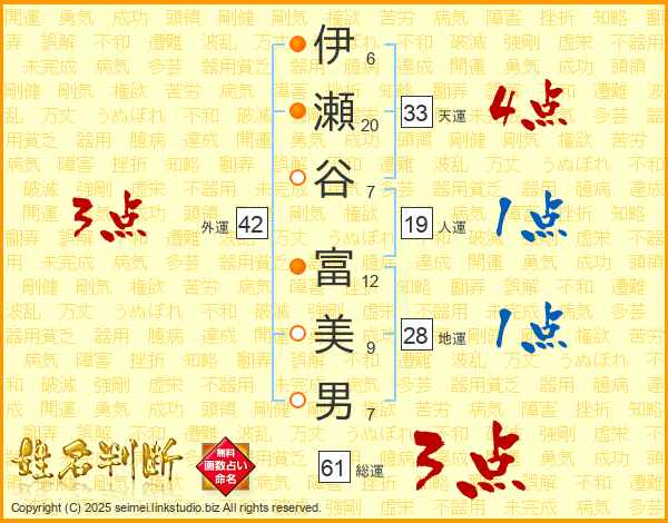 伊(6画)瀬(20画)谷(7画) 富(12画)美(9画)男(7画)