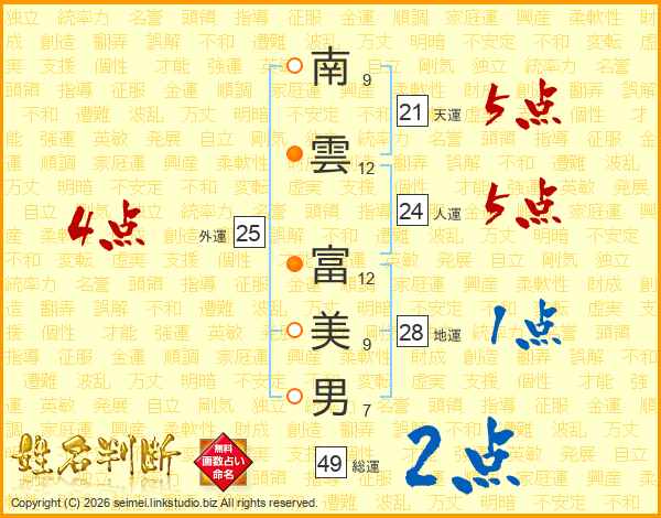 南(9画)雲(12画) 富(12画)美(9画)男(7画)