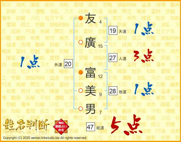 友(4画)廣(15画) 富(12画)美(9画)男(7画)