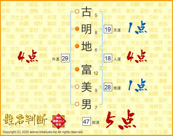 古(5画)明(8画)地(6画) 富(12画)美(9画)男(7画)