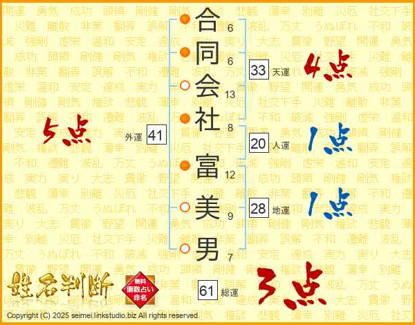 合(6画)同(6画)会(13画)社(8画) 富(12画)美(9画)男(7画)