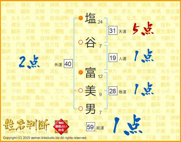 塩(24画)谷(7画) 富(12画)美(9画)男(7画)