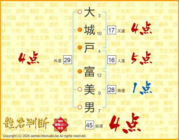 大(3画)城(10画)戸(4画) 富(12画)美(9画)男(7画)