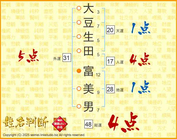大(3画)豆(7画)生(5画)田(5画) 富(12画)美(9画)男(7画)