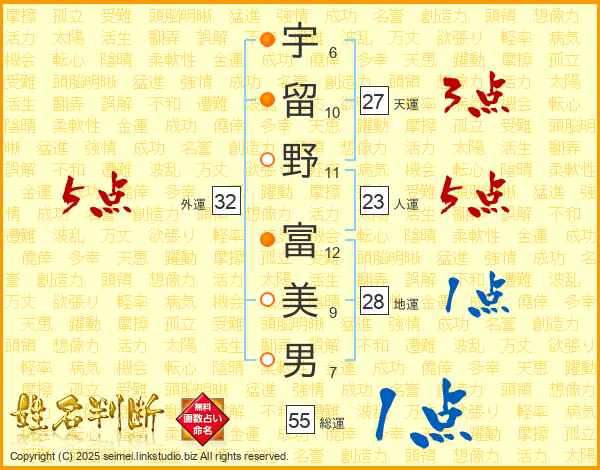 宇留野富美男さんの外運は32画の5点!