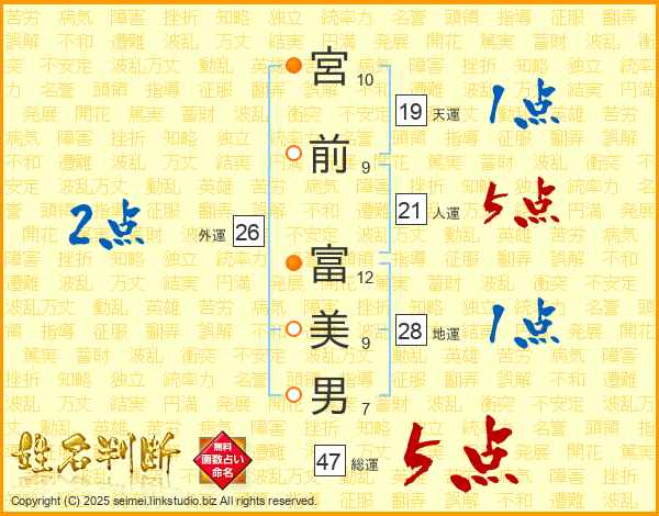 宮(10画)前(9画) 富(12画)美(9画)男(7画)