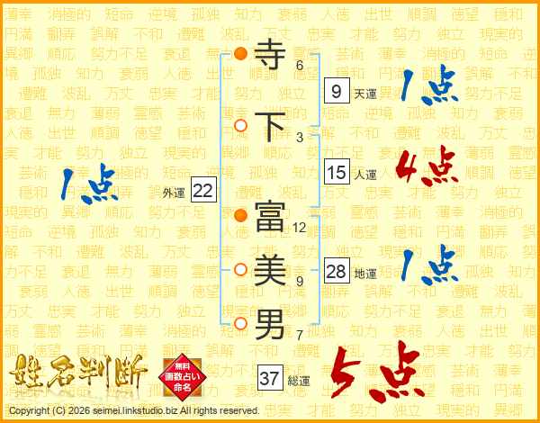 寺下富美男さんの総運は37画の5点!