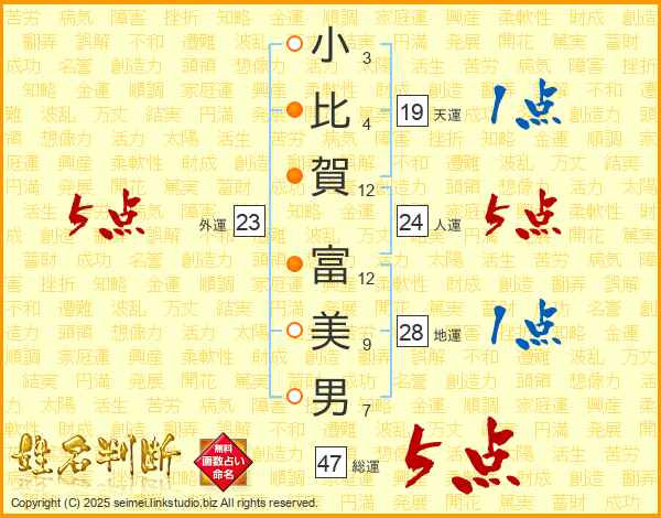 小(3画)比(4画)賀(12画) 富(12画)美(9画)男(7画)