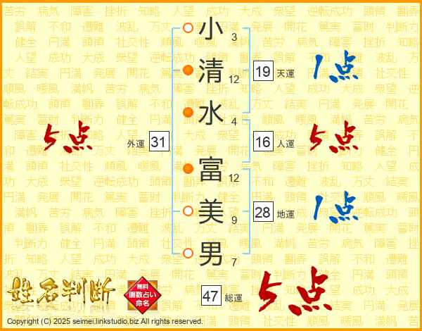 小(3画)清(12画)水(4画) 富(12画)美(9画)男(7画)