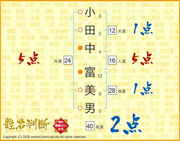 小(3画)田(5画)中(4画) 富(12画)美(9画)男(7画)