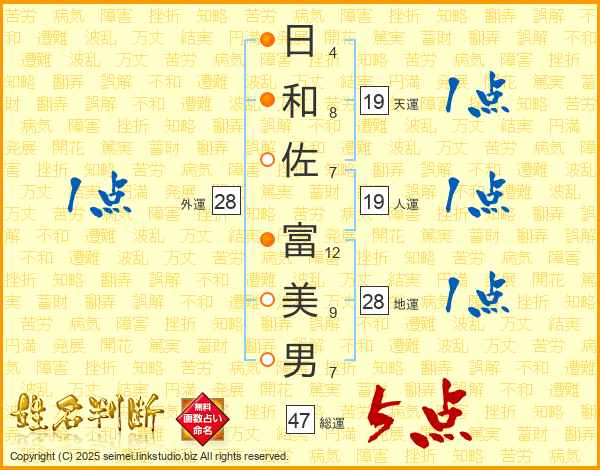日(4画)和(8画)佐(7画) 富(12画)美(9画)男(7画)