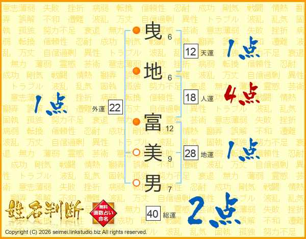曳(6画)地(6画) 富(12画)美(9画)男(7画)