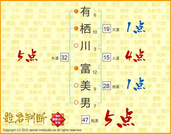有栖川富美男さんの総運は47画の5点!
