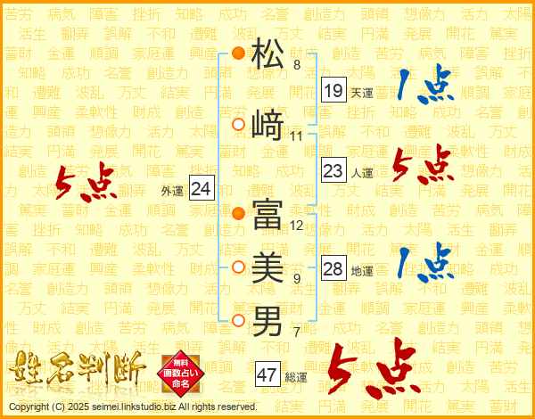 松(8画)﨑(11画) 富(12画)美(9画)男(7画)