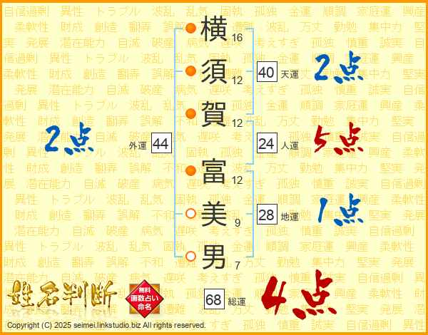 横(16画)須(12画)賀(12画) 富(12画)美(9画)男(7画)