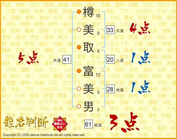 樽(16画)美(9画)取(8画) 富(12画)美(9画)男(7画)