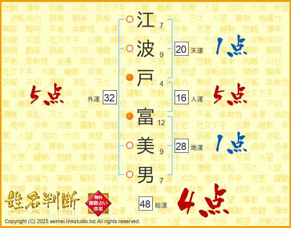江(7画)波(9画)戸(4画) 富(12画)美(9画)男(7画)