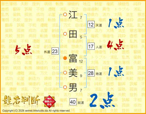 江(7画)田(5画) 富(12画)美(9画)男(7画)