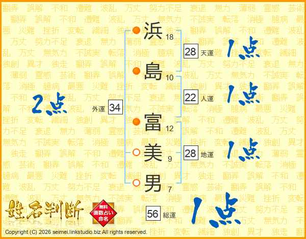 浜(18画)島(10画) 富(12画)美(9画)男(7画)