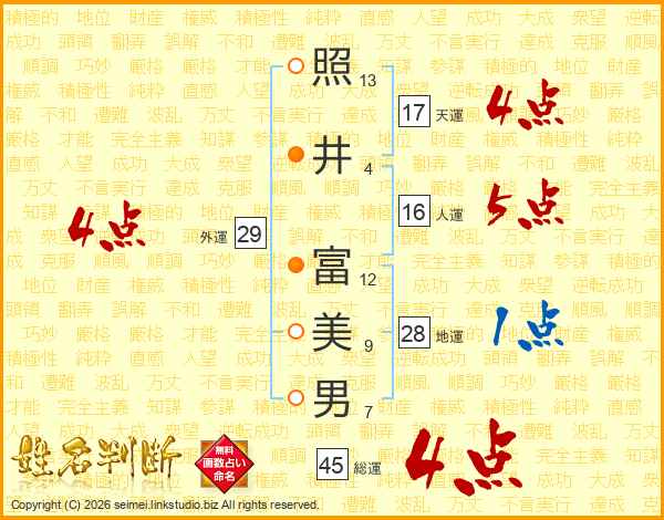 照(13画)井(4画) 富(12画)美(9画)男(7画)
