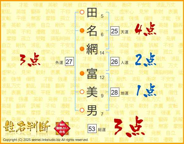 田(5画)名(6画)網(14画) 富(12画)美(9画)男(7画)